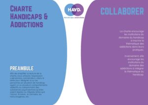 La charte encourage les institutions du domaine du handicap à inscrire la thématique des addictions à leurs pratiques. Inversement, elle encourage les institutions du domaine des addictions à intégrer la thématique du handicap.